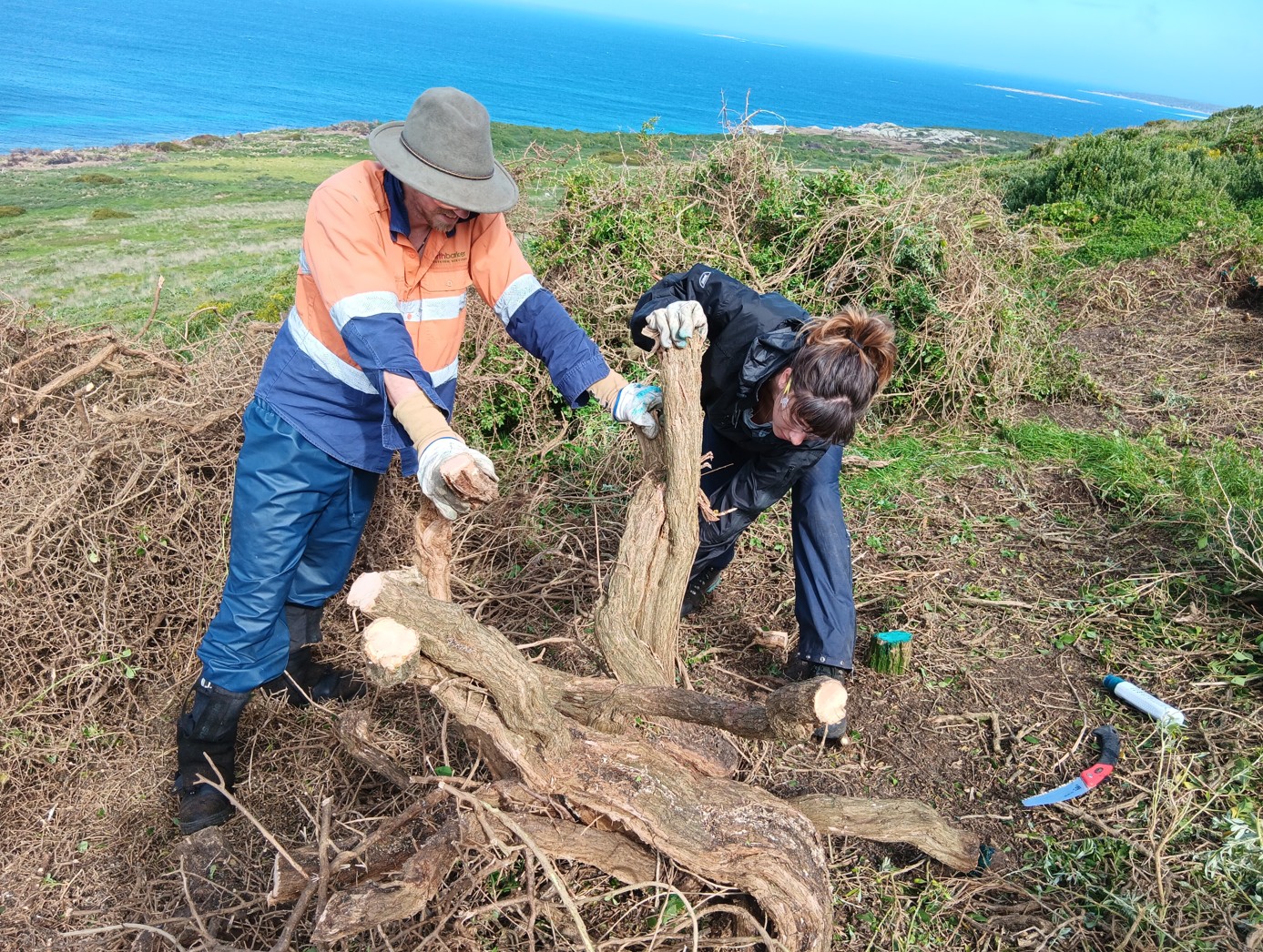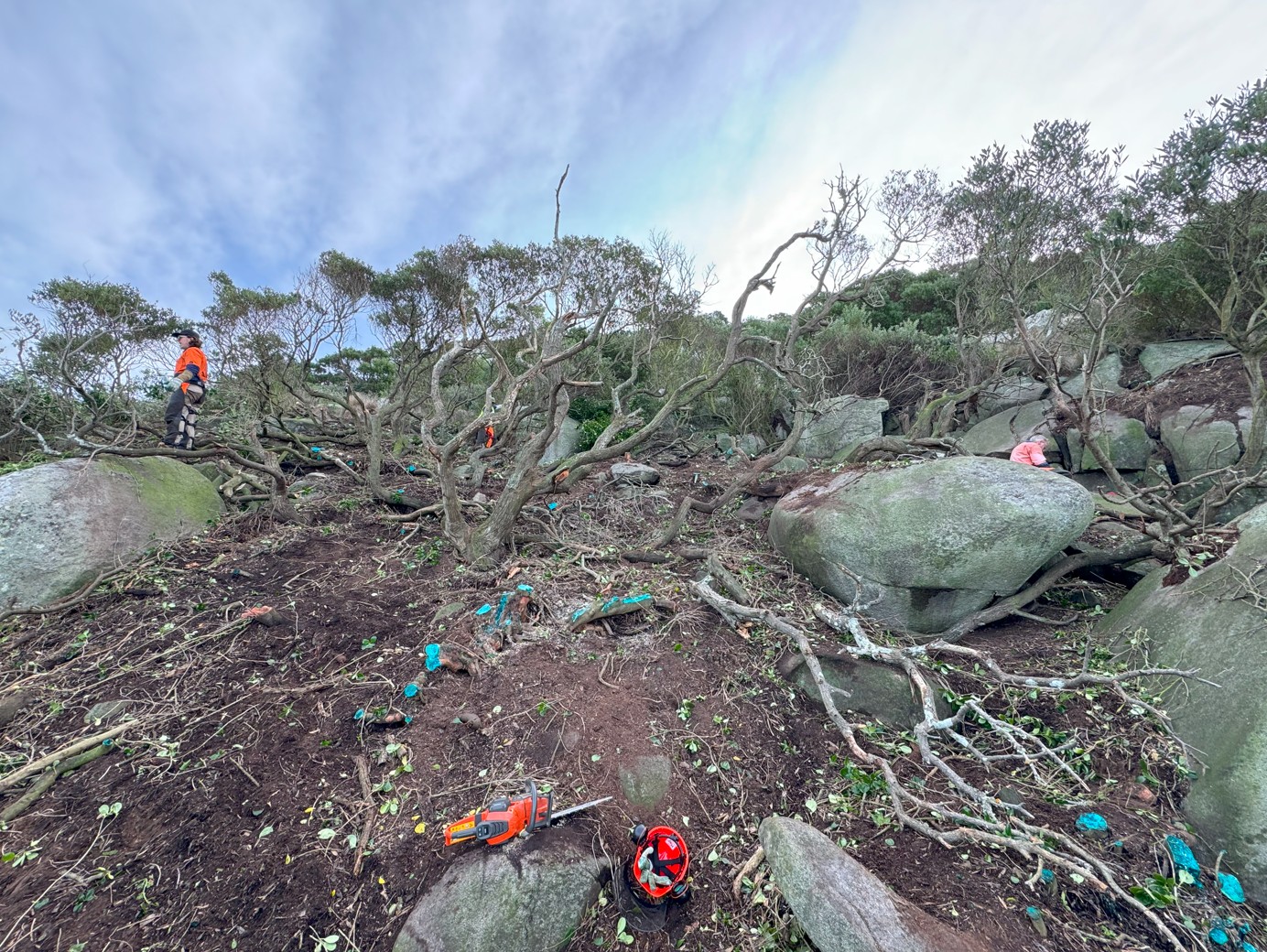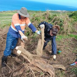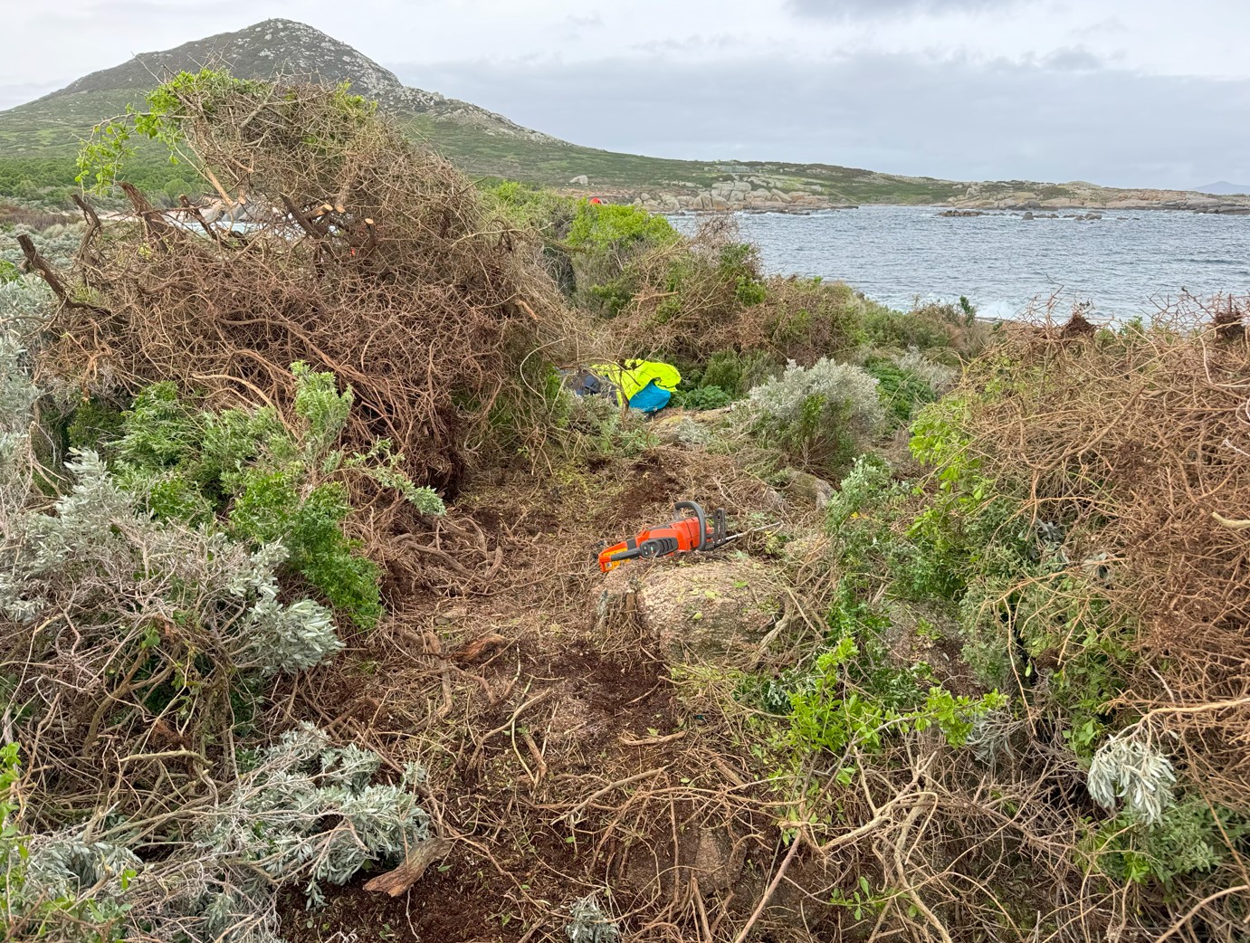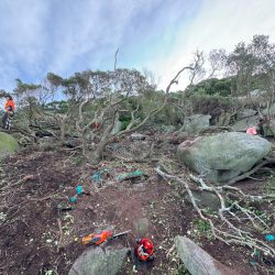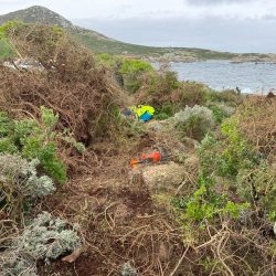 So, with that in mind, FOBSI and our team had one clear mission: to battle the boxthorn. Braving harsh winds and remote conditions, the team removed boxthorn from the steep slopes and hard to reach places that TAC Rangers’ machinery couldn’t get to. The trip not only marked a continued step in ongoing weed management on the island, but also deepened our connections with the land and its cultural heritage, and opened the door for future NBES participants to aid the TAC Rangers mission of restoring Mt Chappell.