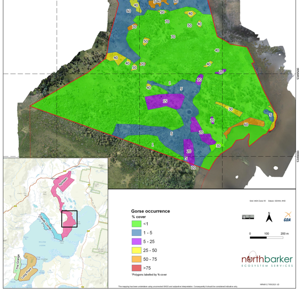 Extensive patches of gorse were found to exist in areas adjacent to the wetland, with smaller patches of African boxthorn detected within isolated areas throughout cattle grazing zones.