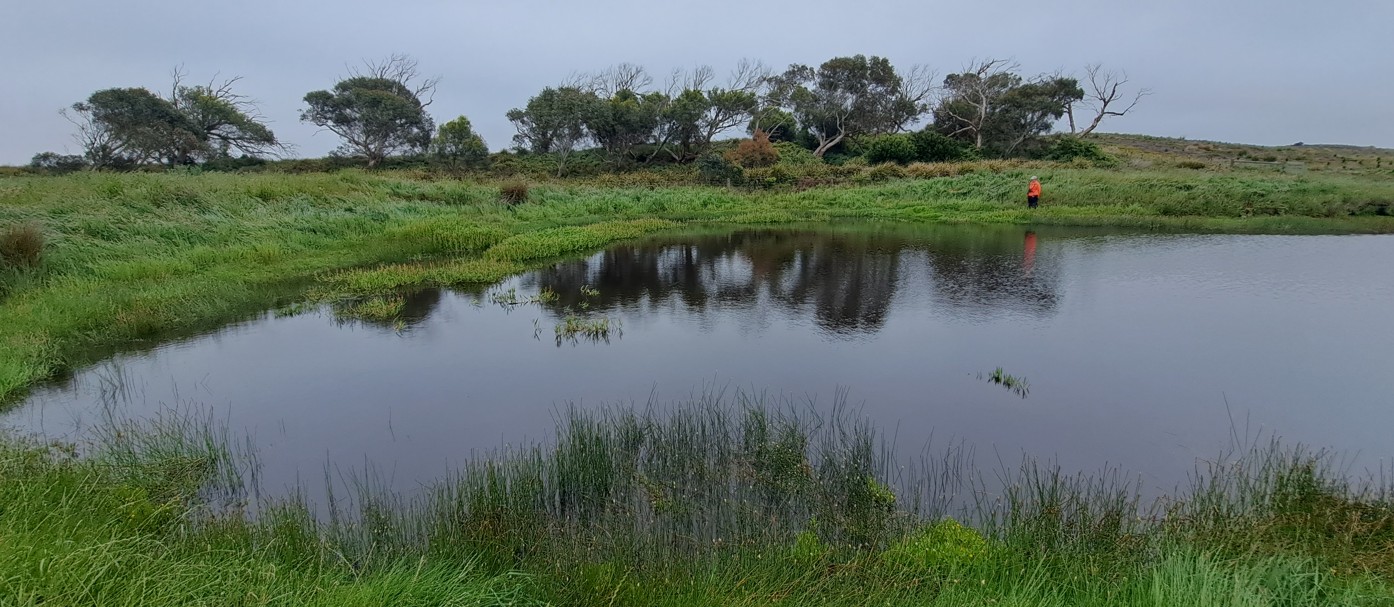 To target frog species, our team use traditional and innovative methods to capture a suite of data and cut down on false negatives – we also optimise detection rates by targeting the breeding season when the frogs are most actively calling, both during the day and at night. Our methods include active on-ground searches, listening for calls, call-back surveys, eDNA, and bioacoustics. In particular we are advancing use of the latter, deploying passive acoustic monitoring devices for weeks and months at time, dramatically increasing survey effort compared to traditional methods. Analysis of the recordings is undertaken in-house by expert and trained acoustic specialists, to identify detections of the striped marsh frog and its distinctive “tuk” and “whuck” calls – can you pick them in the recording below?